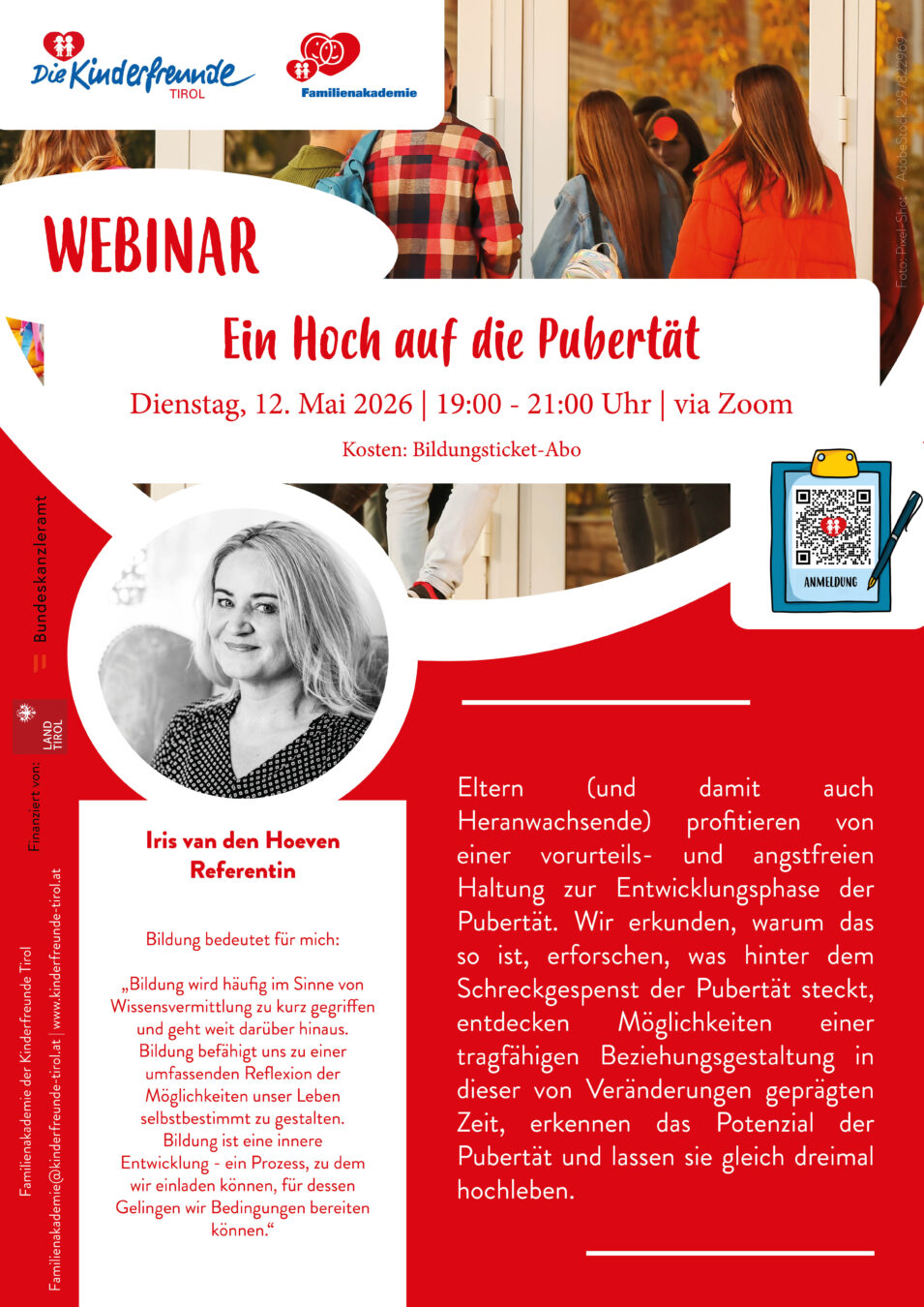 Dank der Förderungen des Bundeskanzleramtes und des Landes Tirol ist die Teilnahme an den Online-Webinaren grundsätzlich kostenlos. Für die organisatorische Abwicklung und Durchführung der Webinare (z. B. Kursplanung, Kommunikation, Betreuung der Teilnehmer:innen) ist lediglich einmalig ein geringer Kostenbeitrag in der Höhe von € 34,– für das gesamte Bildungsticket-Abonnement 2025/26 zu entrichten. |