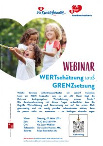 Erfahren Sie mehr »Welche Grenzen sollen/müssen/dürfen wir setzen? Inwiefern kann ein NEIN liebevoller sein als ein JA? Worin liegt die Relevanz bedingungsloser Wertschätzung unserer Kinder? Die Auseinandersetzung mit diesen Fragen verdeutlicht, dass die Begriffe Wertschätzung und Grenzsetzung nur auf den ersten Blick grenz-wertig und ein wenig paradox nebeneinander stehen, denn sie passen nicht nur zusammen – sie bedingen einander sogar. Hier gibt's die Eckdaten zum Webinar: Wann: Dienstag, 25. Juli 2023 Wo: via Zoom-Webinar Zeit: 19:30 – 21:30 Uhr Referentin: Iris van den…