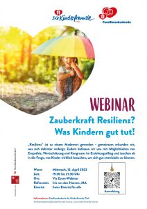 Erfahren Sie mehr »„Resilienz“ ist zu einem Modewort geworden - gemeinsam erkunden wir, was sich dahinter verbirgt. Zudem befassen wir uns mit Möglichkeiten von Empathie, Wertschätzung und Kongruenz im Erziehungsalltag und tauchen ab in die Frage, was Kinder wirklich brauchen, um sich gut entwickeln zu können. Hier gibt's die Eckdaten zum Webinar: Wann: Mittwoch, 12. April 2023 Wo: via Zoom-Webinar Zeit: 19:30 – 21:30 Uhr Referentin: Iris van den Hoeven, MA Kosten: Kostenloses Webinar Anmeldung: https://forms.gle/weWR7fgPyEezLn6F8 Informationen zum Angebot: Die Familienakademie der Kinderfreunde…