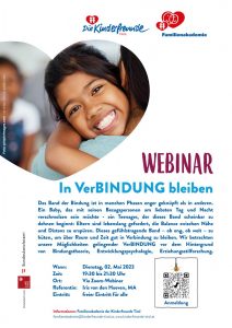 Erfahren Sie mehr »Das Band der Bindung ist in manchen Phasen enger geknüpft als in anderen. Ein Baby, das mit seinen Bezugspersonen am liebsten Tag und Nacht verschmolzen sein möchte - ein Teenager, der dieses Band scheinbar zu dehnen beginnt: Eltern sind lebenslang gefordert, die Balance zwischen Nähe und Distanz zu erspüren. Dieses gefühlstragende Band – ob eng, ob weit – zu hüten, um über Raum und Zeit gut in Verbindung zu bleiben. Wir betrachten unsere Möglichkeiten gelingender VerBINDUNG vor dem Hintergrund von…