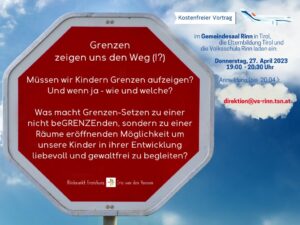Erfahren Sie mehr »Müssen wir Kindern Grenzen aufzeigen? Und wenn ja - wie und welche? Was macht Grenzen-Setzen zu einer nicht beGRENZEnden, sondern zu einer Räume eröffnenden Möglichkeit um unsere Kinder in ihrer Entwicklung liebevoll und gewaltfrei zu begleiten? Was hat Grenzen-Setzen mit Resilienz und Selbstfürsorge zu tun? Und wie können wir im Erziehungsalltag unseren Kindern Johann Wolfgang von Goethes „Wurzeln und Flügel“ mitgeben? Kostenfreier Vortrag im Gemeindesaal Rinn in Tirol, die Elternbildung Tirol und die Volksschule Rinn laden ein: Donnerstag, 27. April 2023…