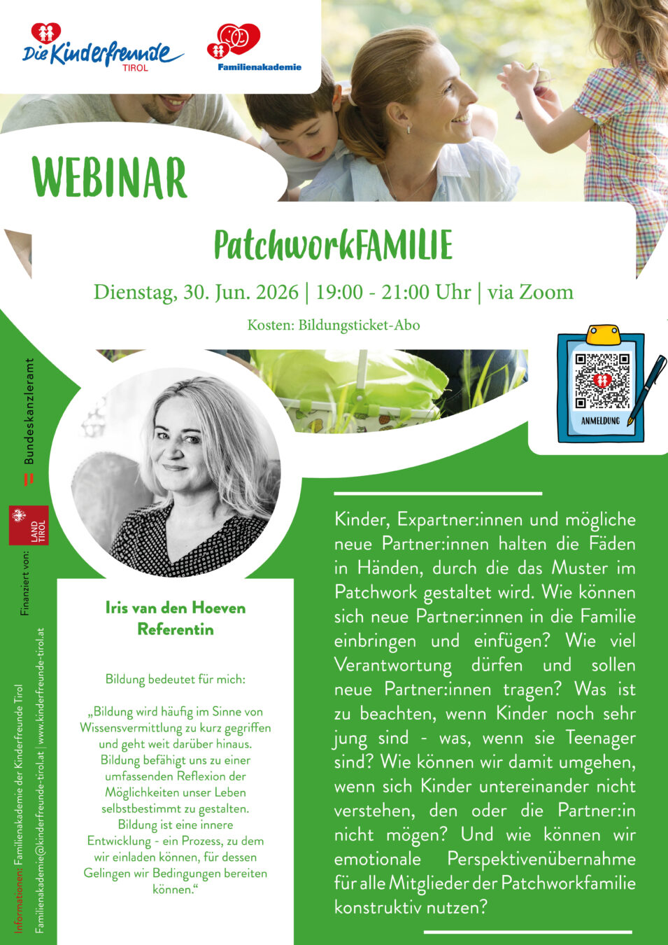 Kinder, Expartner:innen und mögliche neue Partner:innen halten die Fäden in Händen, durch die das Muster im Patchwork gestaltet wird. Wie können sich neue Partner:innen in die Familie einbringen und einfügen? Wie viel Verantwortung dürfen und sollen neue Partner:innen tragen? Was ist zu beachten, wenn Kinder noch sehr jung sind – was, wenn sie Teenager sind? Wie können wir damit umgehen, wenn sich Kinder untereinander nicht verstehen, den oder die Partner:in nicht mögen? Und wie können wir emotionale Perspektivenübernahme für alle Mitglieder der Patchworkfamilie konstruktiv nutzen?