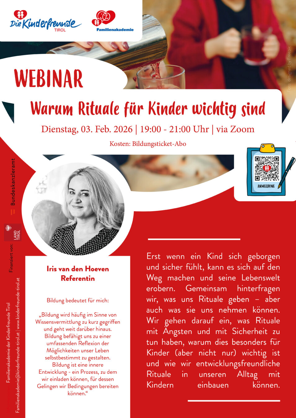 | Dank der Förderungen des Bundeskanzleramtes und des Landes Tirol ist die Teilnahme an den Online-Webinaren grundsätzlich kostenlos. Für die organisatorische Abwicklung und Durchführung der Webinare (z. B. Kursplanung, Kommunikation, Betreuung der Teilnehmer:innen) ist lediglich einmalig ein geringer Kostenbeitrag in der Höhe von € 34,– für das gesamte Bildungsticket-Abonnement 2025/26 zu entrichten. |